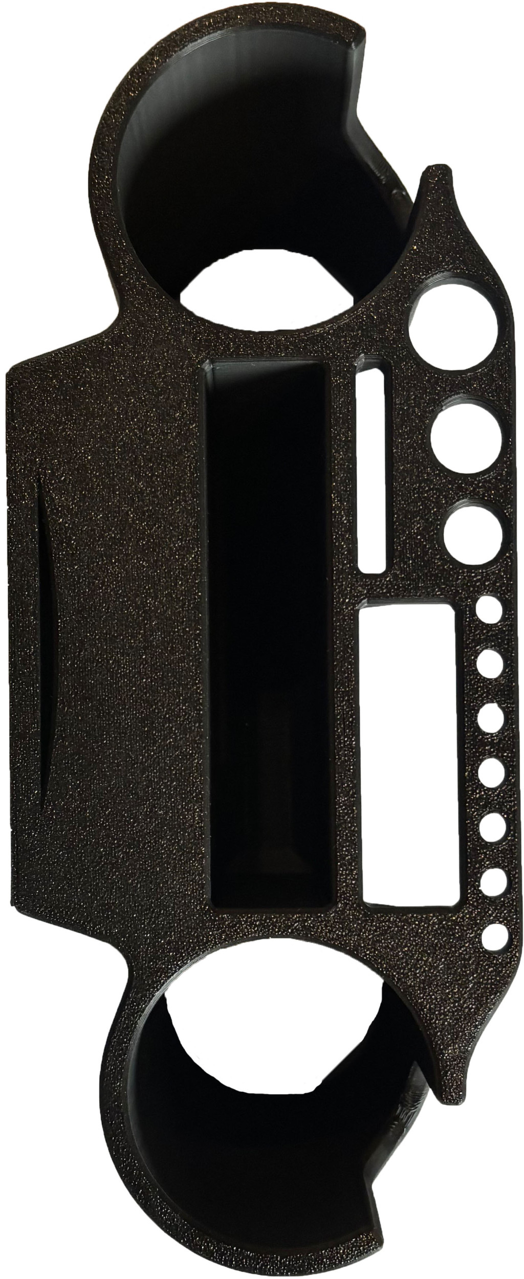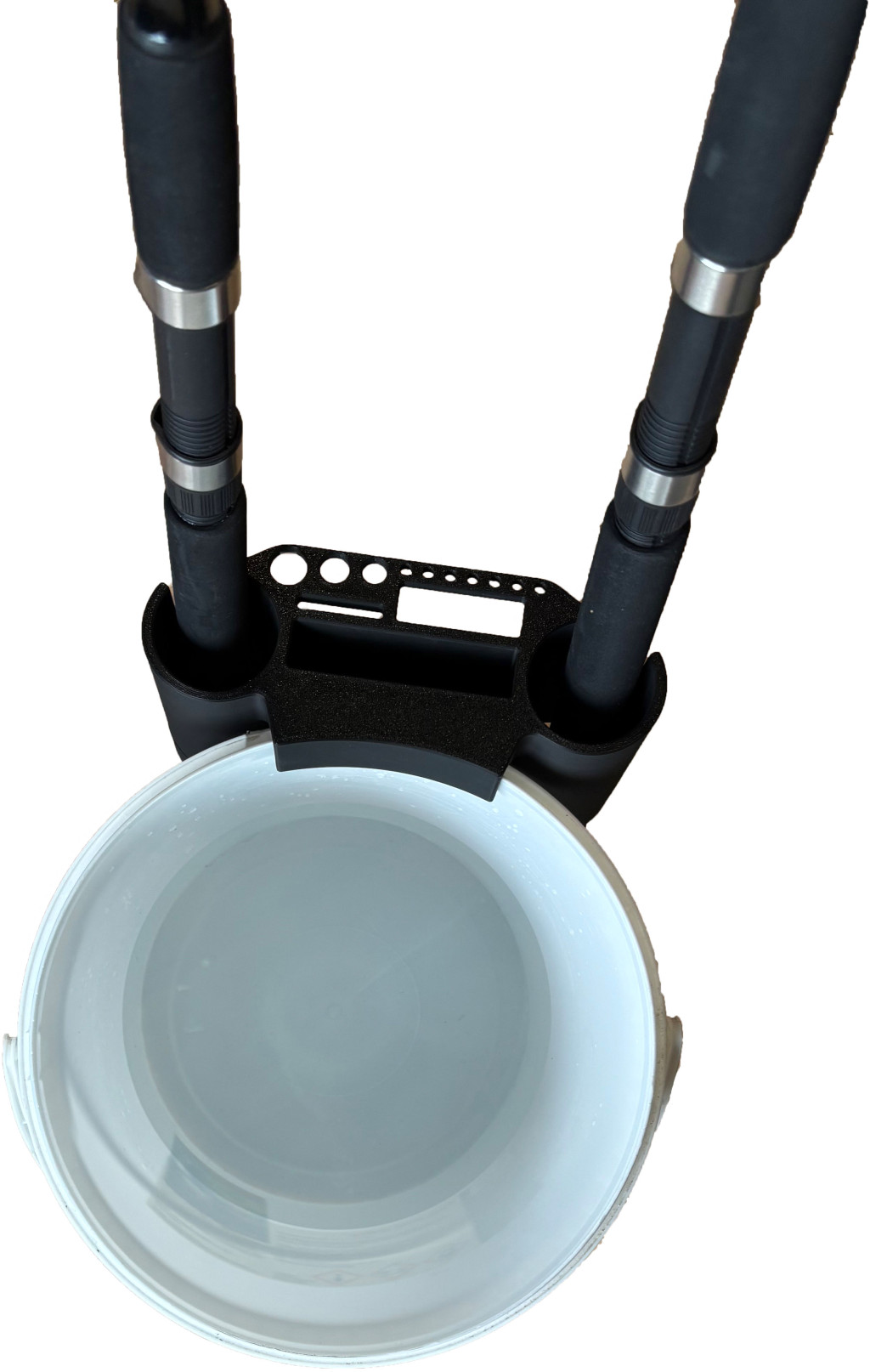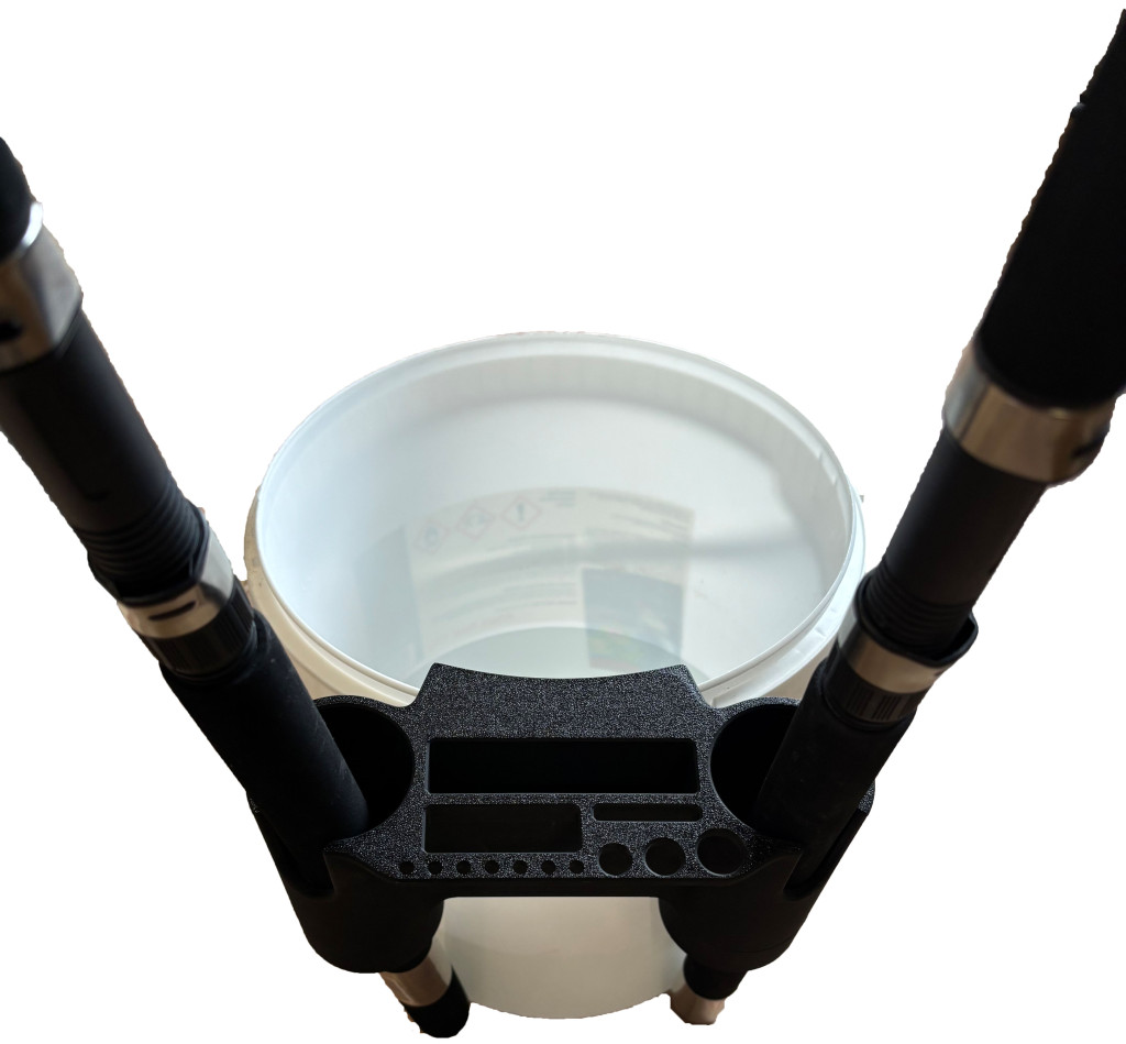 3D nyomtatással készült praktikus és stabil bottartó, amit egyszerűen a vödör peremére rögzíthetsz.Két bot tárolására alkalmas, emellett több rekesz és lyuk segíti a szerelékek, fogó, olló vagy egyéb horgászeszközök rendszerezését.